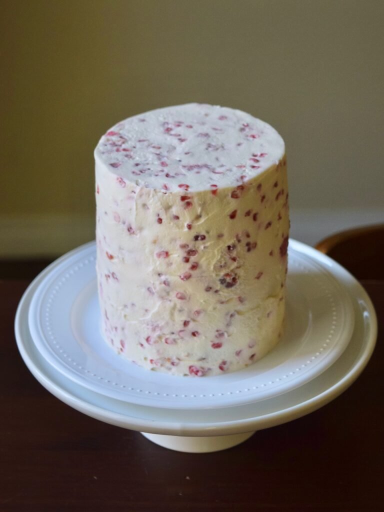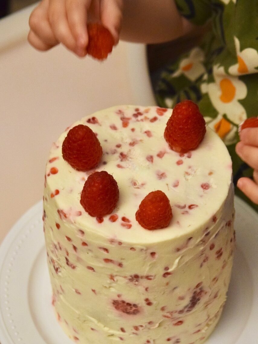 When it was almost time for our first grand baby to celebrate her first birthday, I asked if I could make her a cake. I took the notes down for what was wanted (and not wanted), and I created this recipe for a “fruits and grains” cake, based on those wishes. The frosting is a whipped cream cheese using only raspberries to sweeten. The whole key to inviting Baby to dig in and demolish this cake were the raspberries, because they are baby’s favorite food in the world right now. This was such a fun and happy memory for all of us!