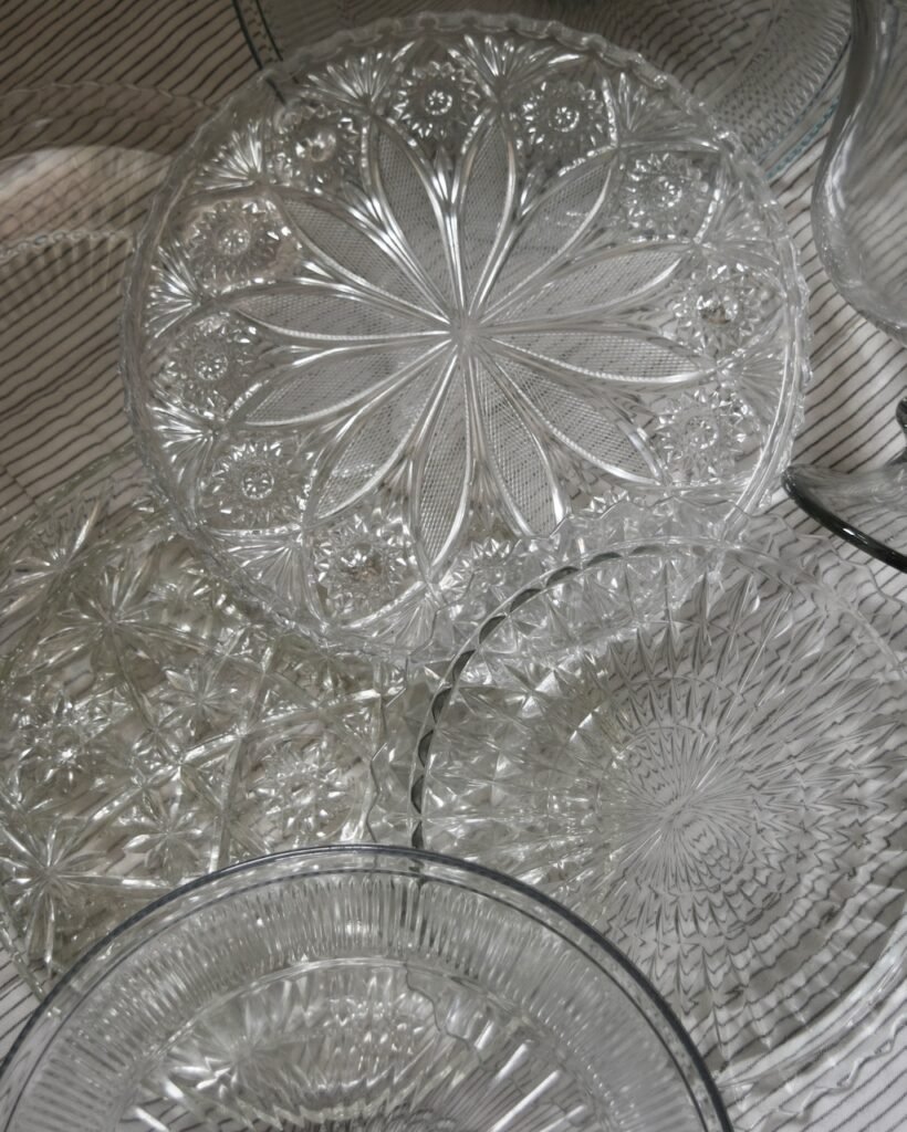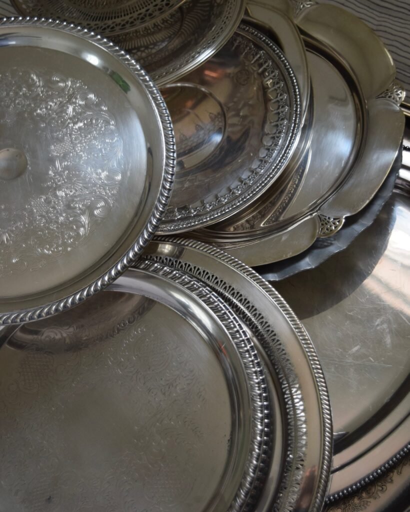 To bring the vision to life, we styled two 8-foot farm tables using our own pale ivory linens, layered and softly draped for texture and movement. Covered risers added height and dimension with our “Antique Silver” collection as foundation for the look, mixed in with our “Old World Glass” pieces to balance it out.